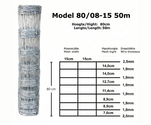 Het lichte schapengaas is gemaakt van verzinkt afrasteringsdraad, waardoor het bestand is tegen roest en weersinvloeden. Zo profiteer je van een lange levensduur tegen een lage prijs.