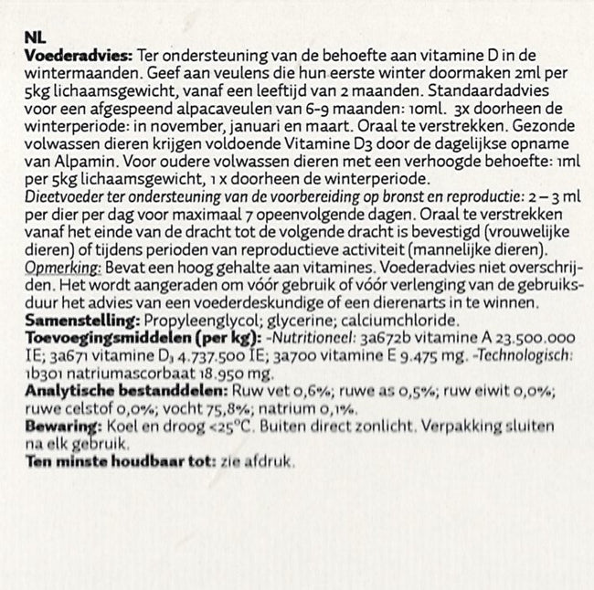 Alpaca veulens in Europa krijgen door lagere UV-straling en kortere winterdagen minder vitamine D3 aanmaak in de huid dan hun soortgenoten in het Andesgebergte. Vitamine D is cruciaal voor het calcium-fosformetabolisme en een gezonde botgroei. Een tekort kan leiden tot rachitis, vooral bij veulens van 2 tot 12 maanden oud. Cria Vitamine AD3E zorgt voor de noodzakelijke aanvulling tijdens de wintermaanden. Volwassen alpaca’s en lama’s hebben doorgaans voldoende aan Alpamin om hun vitamine D-gehalte op peil te houden.