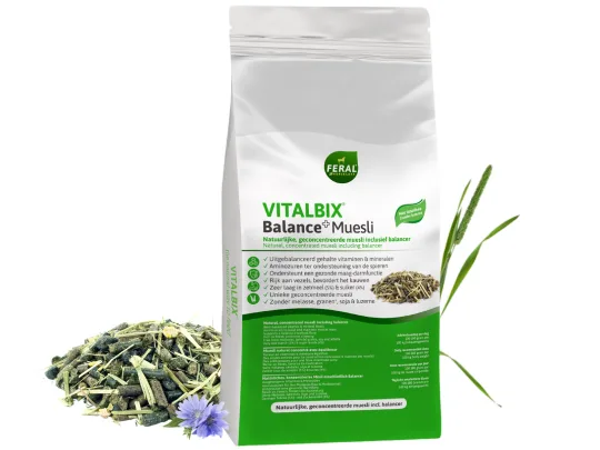 Vitalbix Balance+ Muesli bevat zoals je van ons gewend bent enkel het beste uit de natuur! Deze unieke muesli zit boordevol vezels en goed opneembare vitaminen en mineralen. Balance+ muesli bevat een super complete balancer en is ideaal als complete aanvulling op het ruwvoer. Doordat het een hoge dosering vitaminen en mineralen bevat hoef je er niet veel van te voeren. Zoals wij bij Vitalbix zeggen “minder voeren met meer resultaat!” Het bevat en bevat geen (hele) granen, melasse, soja en luzerne en past binnen een luzerne-vrij rantsoen.