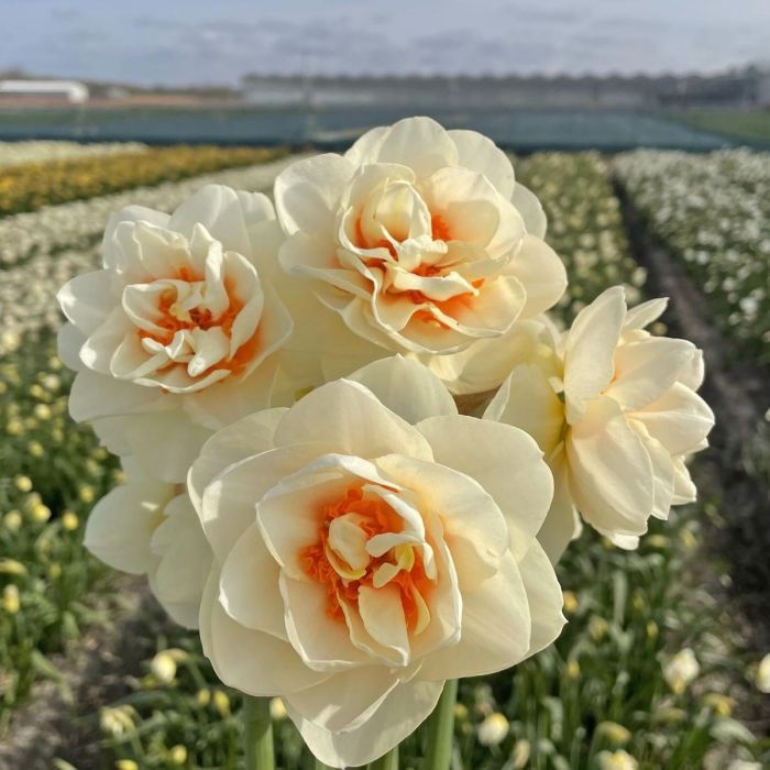 Weer een heel nieuw pareltje in ons assortiment narcissen. Haar naam is Gay Kybo en ze heeft al vele internationale prijzen gewonnen op diverse tentoonstellingen. Dat snappen wij want het is echt een beauty. Dubbele grote crèmekleurige bloemen met binnenin een oranje hartje, deze zullen wel de show stelen in je tuin. En het voordeel van narcissen is dat ze gewoon jaren achter elkaar vanzelf terug blijven komen!