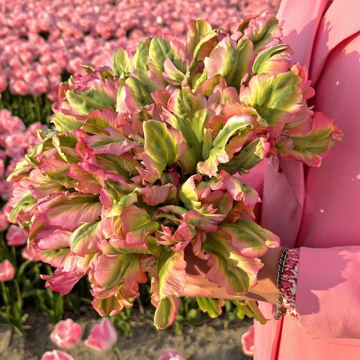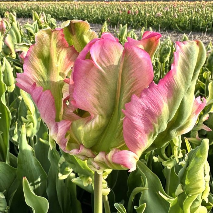 Als je wat bijzonders wilt dan is deze roze met groene parkiettulp een goede keuze. Je blijft je verwonderen over deze tulp genaamd Green Wave. Telkens heeft ze weer een andere vorm en kleur. Als ze nog in de knop zit, als ze gaat bloeien, wanneer de bloemen open gaan, maar ook als ze is uitgebloeid. Deze opvallende parkiettulp is een late bloeier.