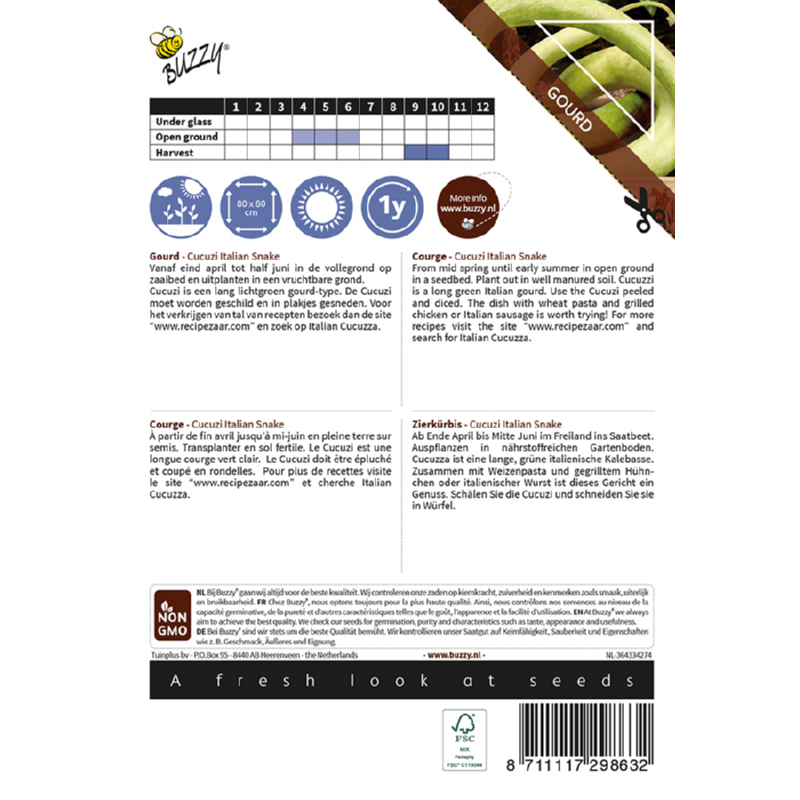 Zaai van eind April tot half Juni in de vollegrond op een zaaibed en plant uit in vruchtbare, goed doorlatende grond. De oogstperiode loopt van September tot Oktober. Voor tal van recepten kun je online inspiratie vinden, bijvoorbeeld op recipezaar.com onder “Italian Cucuzza”.