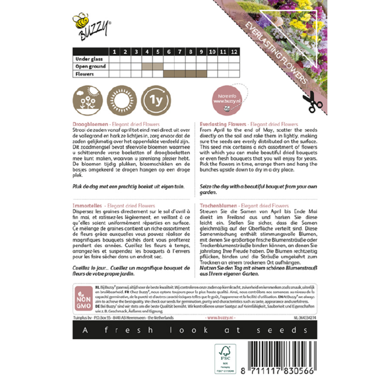 Met Buzzy Colourful Bouquets, Elegant Dried Flowers kweek je stijlvolle bloemen voor zowel verse boeketten als elegante droogboeketten. Dit verfijnde zaadmengsel bevat sfeervolle bloemen met een zachte, elegante uitstraling. Zaai de zaden van April tot eind Mei direct in de vollegrond en hark ze lichtjes in voor een gelijkmatige verdeling.