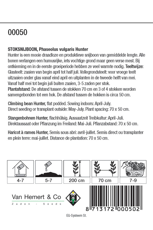 Stoksnijboon Hunter is een mooie, draadloze en zeer productieve snijboon van gemiddelde lengte. Dit betrouwbare ras staat bekend om zijn goede smaak en gelijkmatige oogst. De planten groeien krachtig en geven langdurig opbrengst wanneer ze voldoende warmte en voeding krijgen.