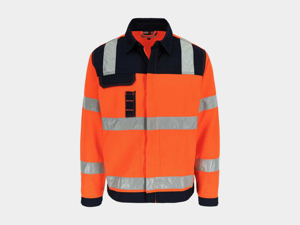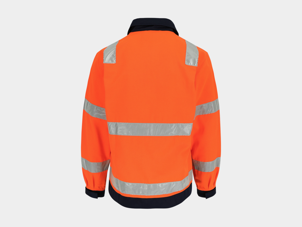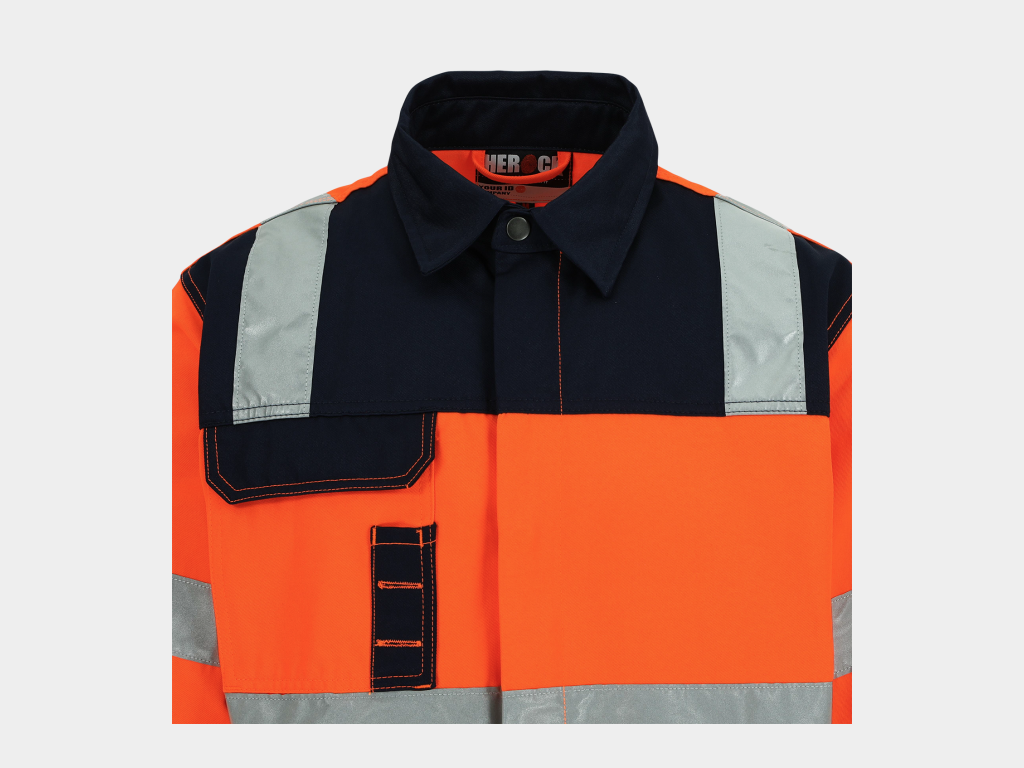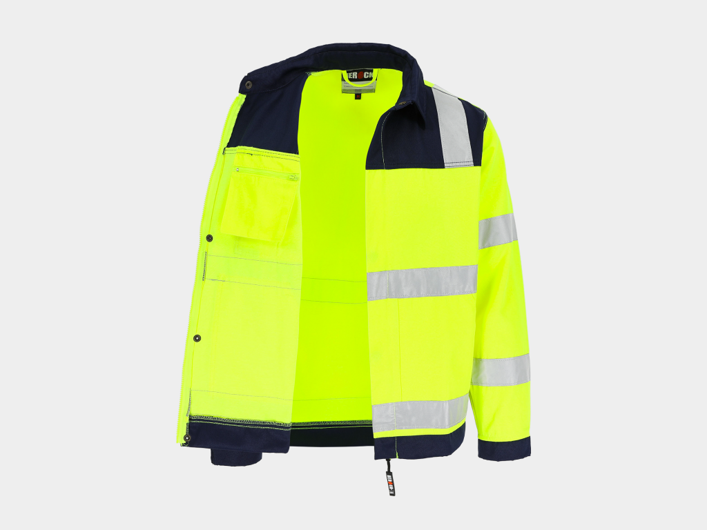 - High-vis werkjas met reflecterende banden (5 cm) rond lichaam, mouwen en schouders