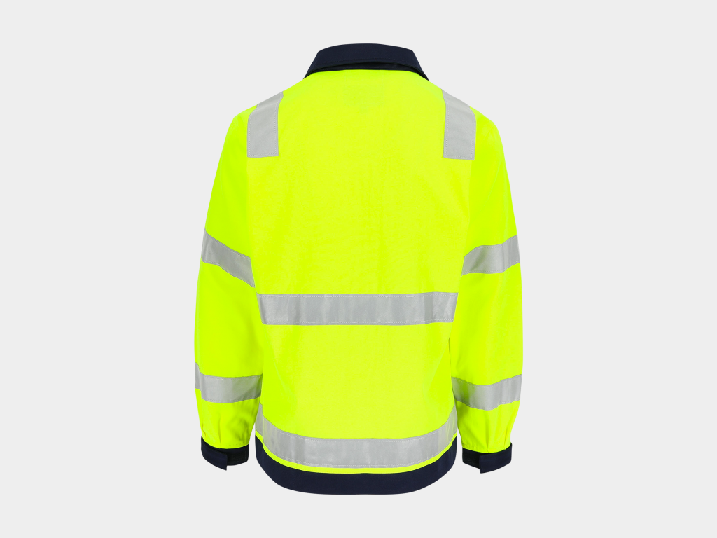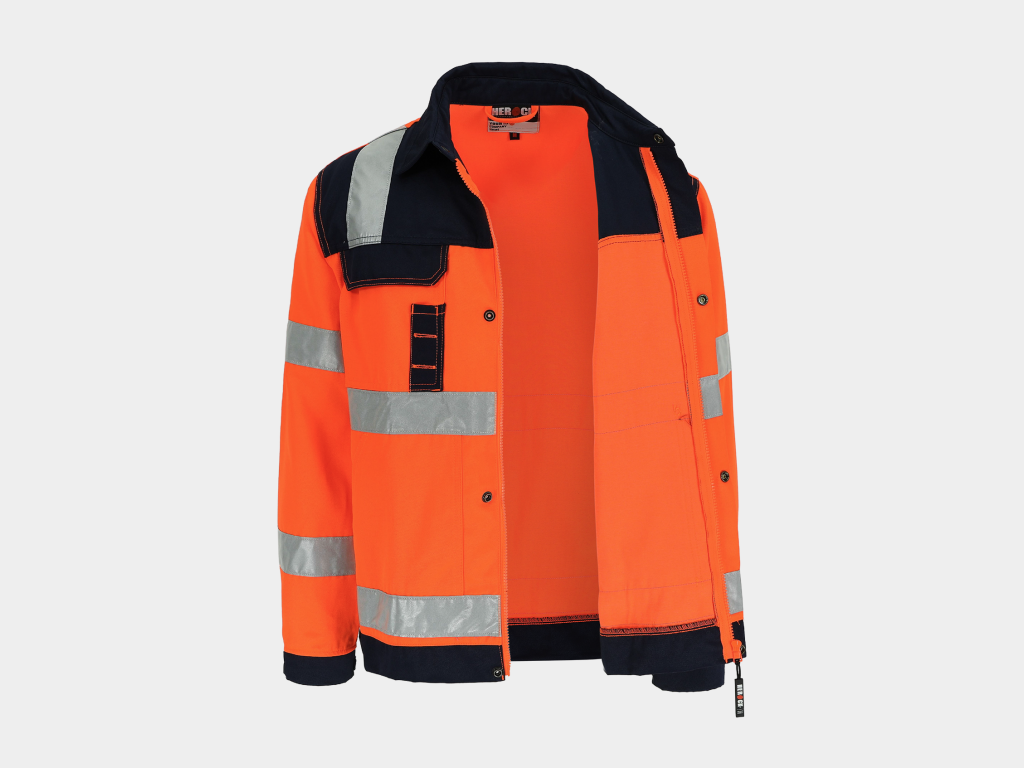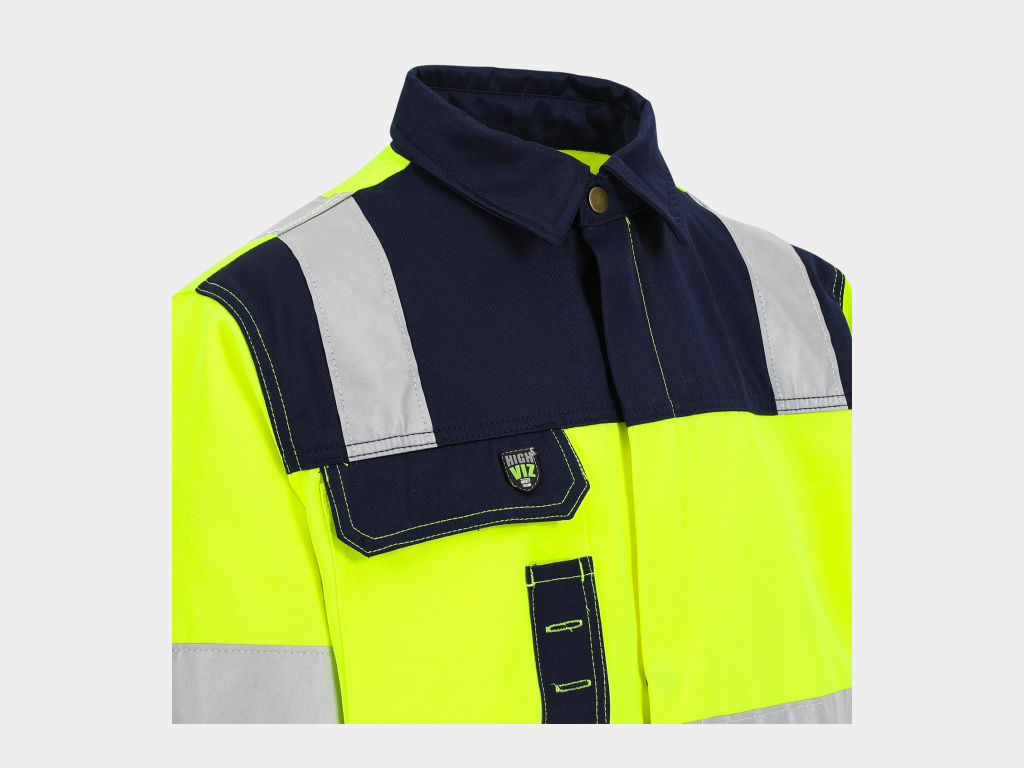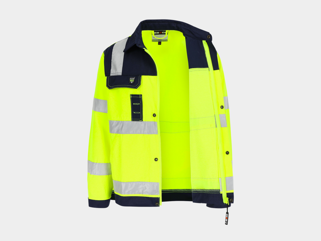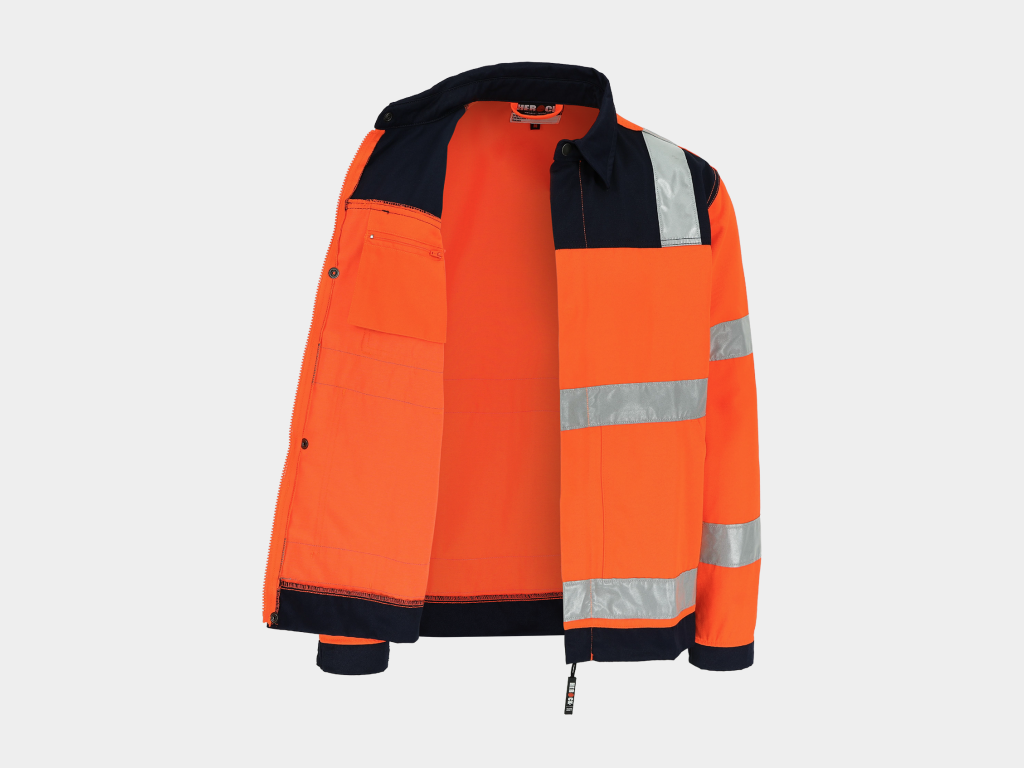 - High-vis werkjas met reflecterende banden (5 cm) rond lichaam, mouwen en schouders