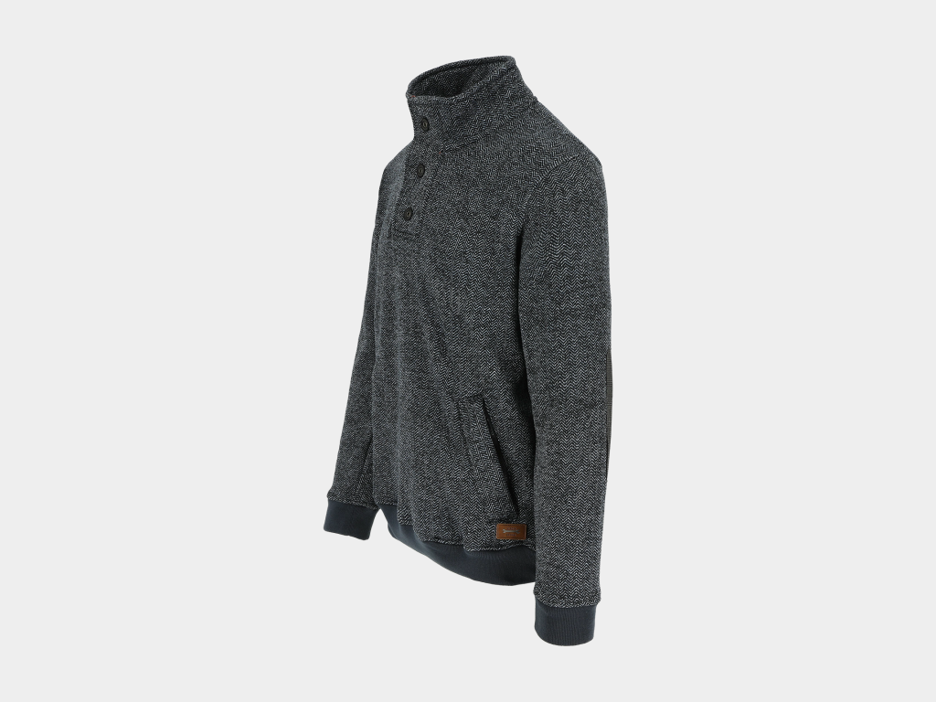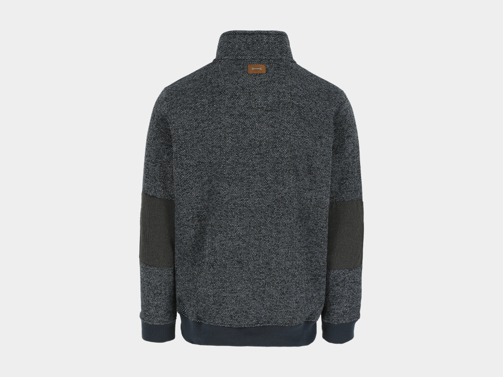 De sweater is voorzien van drukknopen in de hals, versterkte elleboogstukken voor extra duurzaamheid en twee ritszakken om veilig kleine spullen op te bergen.