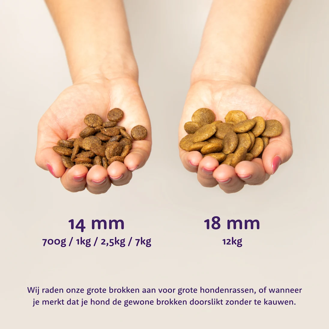 De brokken worden zorgvuldig bereid op lage temperatuur, zodat alle natuurlijke voedingsstoffen en smaken optimaal behouden blijven. Bovendien is dit recept gluten- en graanvrij, en bevat het slechts één dierlijke eiwitbron (monoproteïne). Perfect voor honden met voedselgevoeligheden.
