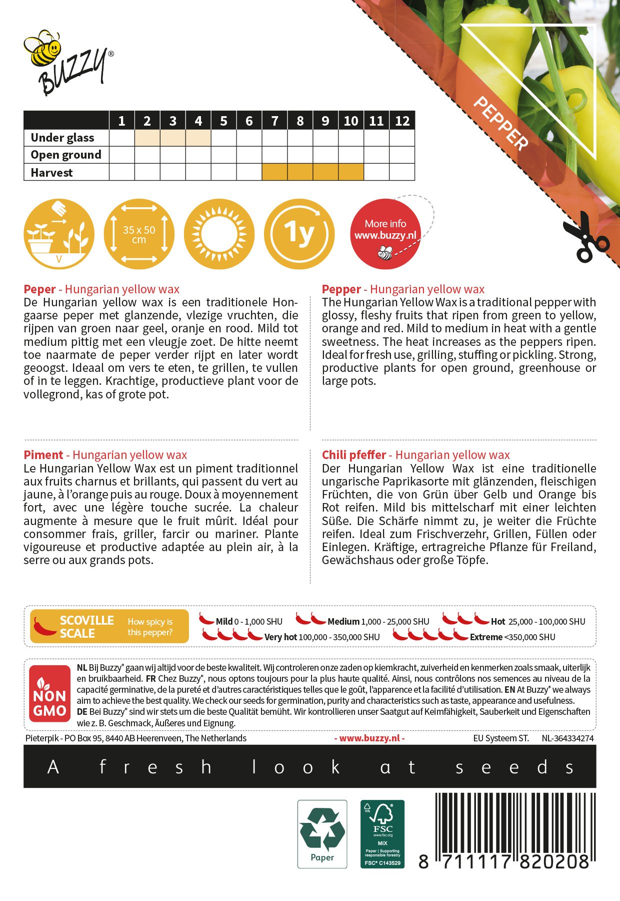 De Buzzy Culinary Peper Hungarian Yellow Wax is een traditionele Hongaarse peper met glanzende, vlezige vruchten die rijpen van groen naar geel, oranje en rood. Met een mild tot medium pittige smaak en een subtiele zoete toets is deze peper veelzijdig in de keuken.