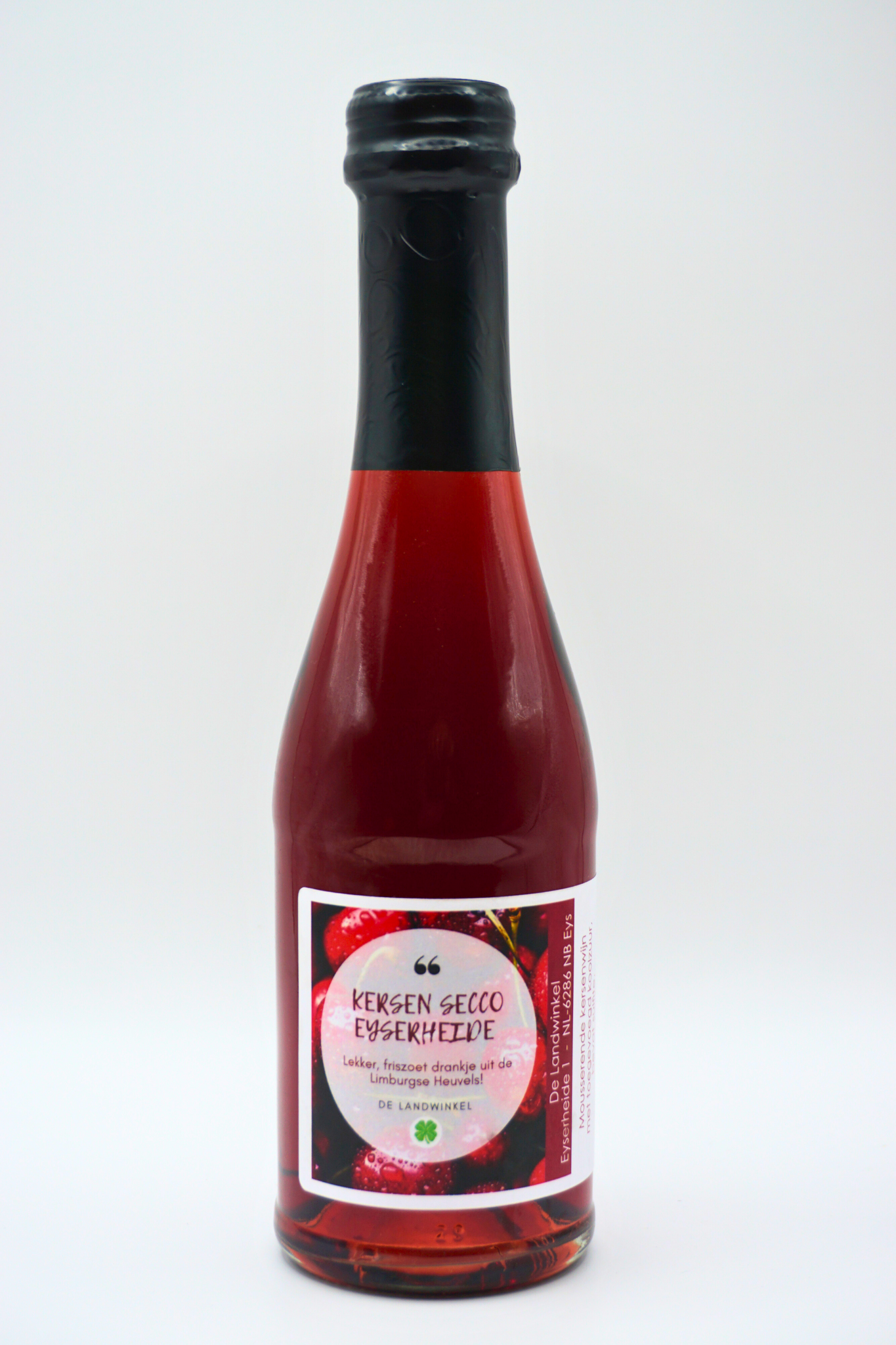 Kersen Secco – Sprankelend Limburgs streekproduct! Onze Kersen Secco is een feestelijk mousserend drankje, gemaakt van zorgvuldig geselecteerde eigen Limburgse kersen. De volle, zoet-frisse smaak van rijpe kersen wordt gecombineerd met een lichte bubbel, wat zorgt voor een elegante en dorstlessende beleving!