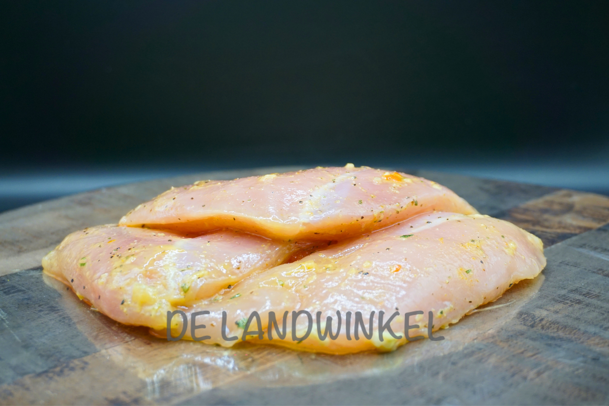 De gemarineerde kipfilet van De Berkelaarshof is heerlijk mals en vol smaak, dankzij een kruidige marinade die perfect past bij allerlei gerechten. De kip is afkomstig van dieren die op kleinschalige en diervriendelijke wijze worden gehouden, met volop ruimte, frisse lucht en rust op de Limburgse akkers en graslanden van het familiebedrijf. Het natuurlijke voer van eigen teelt zorgt voor gezonde groei en kwaliteit die je proeft.