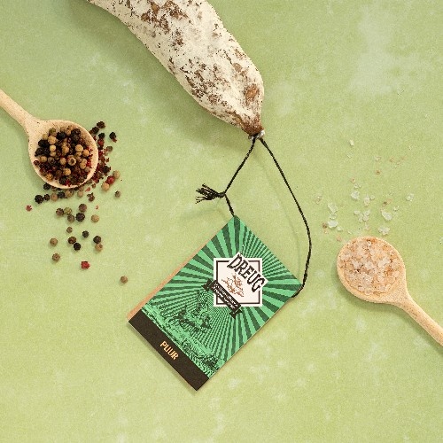De schimmelworst Puur van Dreug is een verfijnde droge worst, zorgvuldig gerijpt en omhuld met een natuurlijke schimmellaag. Gemaakt van eersteklas vlees en zonder kunstmatige toevoegingen, biedt deze worst een authentieke smaakbeleving. De schimmellaag draagt bij aan de ontwikkeling van een complexe en rijke smaak, met een delicate balans tussen hartig en subtiel gefermenteerd. Ideaal als luxueuze snack of bij een borrel, is de schimmelworst Puur een toonbeeld van vakmanschap en puur genieten.
