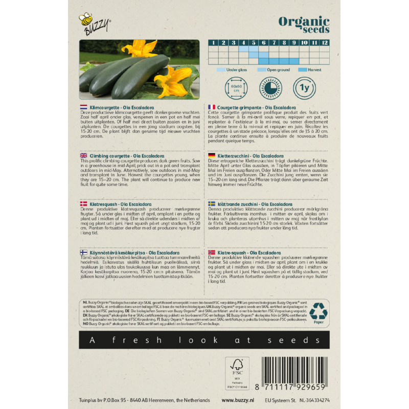 Organic Courgette Ola Escaladora BIO, is een uniek biologisch zadenras voor het kweken van klimmende, donkergroene courgettes met een zachte, milde smaak. Dit ras staat bekend om zijn sterke, verticale groei en hoge opbrengst, waardoor het ideaal is voor Lees meer