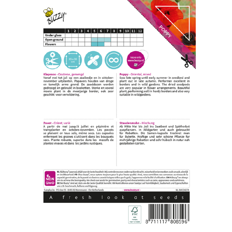 Voeg hoogte en kleur toe aan je tuin met Buzzy Oosterse Klaproos gemengd. Deze meerjarige reuzenklaprozen produceren indrukwekkende bloemen en zijn ideaal voor meerjarige borders, verwildering of gedroogde boeketten. Zaai van Mei tot Juli op een zaaibedje en plant de zaailingen in Oktober-November uit.