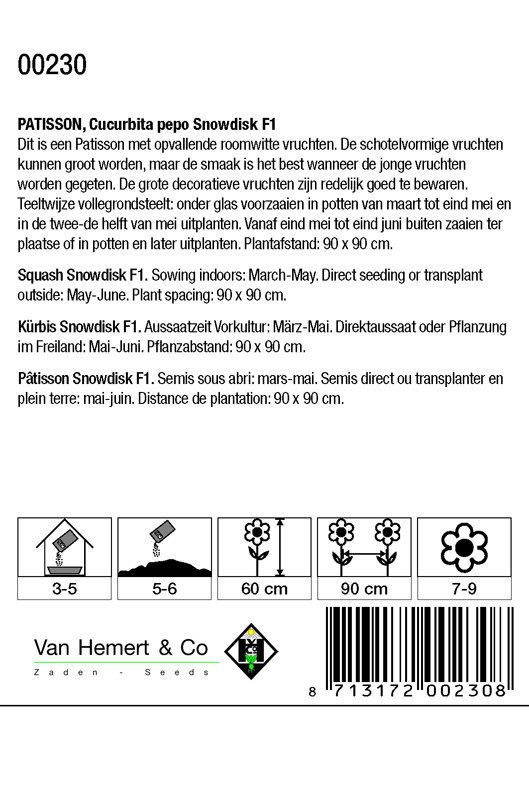 Zaai Patisson Snowdisk F1 en geniet van een snelle, productieve patisson met een unieke witte kleur en glad oppervlak. Deze eenjarige patisson vormt ronde, decoratieve vruchten van 8–12cm., perfect voor koken, grillen, vullen of als kleurrijke toevoeging Lees meer