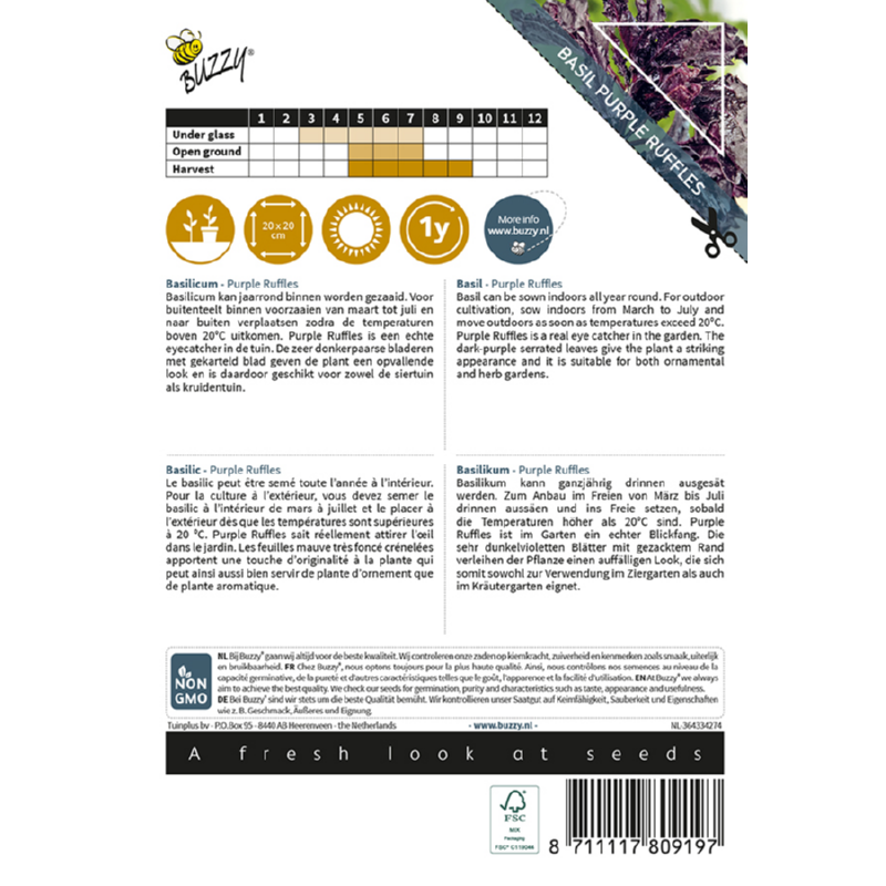 Basilicum kan het hele jaar door binnen worden gezaaid. Voor buitenteelt wordt aanbevolen om voor te zaaien van maart tot juli en de planten pas buiten te zetten zodra de temperatuur boven de 20°C ligt. Purple Ruffles groeit compact tot ca. 30cm. en is eenvoudig te kweken in zowel potten als vollegrond.