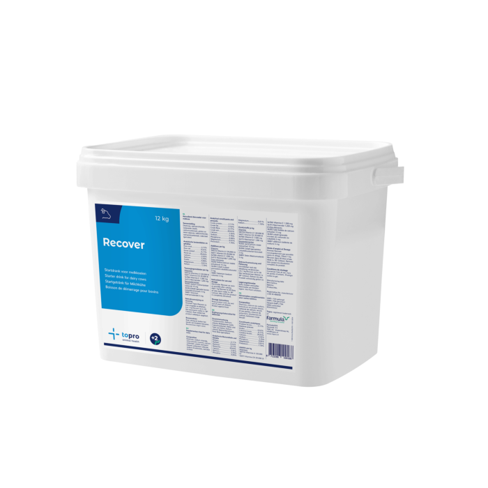 Uniek aan de Topro Recover is de toevoeging van niacine, antioxidanten in de vorm van polyfenolen en een meloenaroma. Niacine is van groot belang voor het algemene metabolisme (stofwisseling). Antioxidanten zijn belangrijk bij het tegengaan van oxidatieve stress. Het meloenaroma draagt bij aan een uitstekende opname. Topro Recover moet worden opgelost in 20 liter warm water. Dit heeft als voordeel dat de pens direct na het afkalven gevuld wordt waarmee de kans op lebmaagdraaiingen wordt verkleind. Door de handige portieverpakking bent u altijd verzekerd van een juiste dosering en vers product.