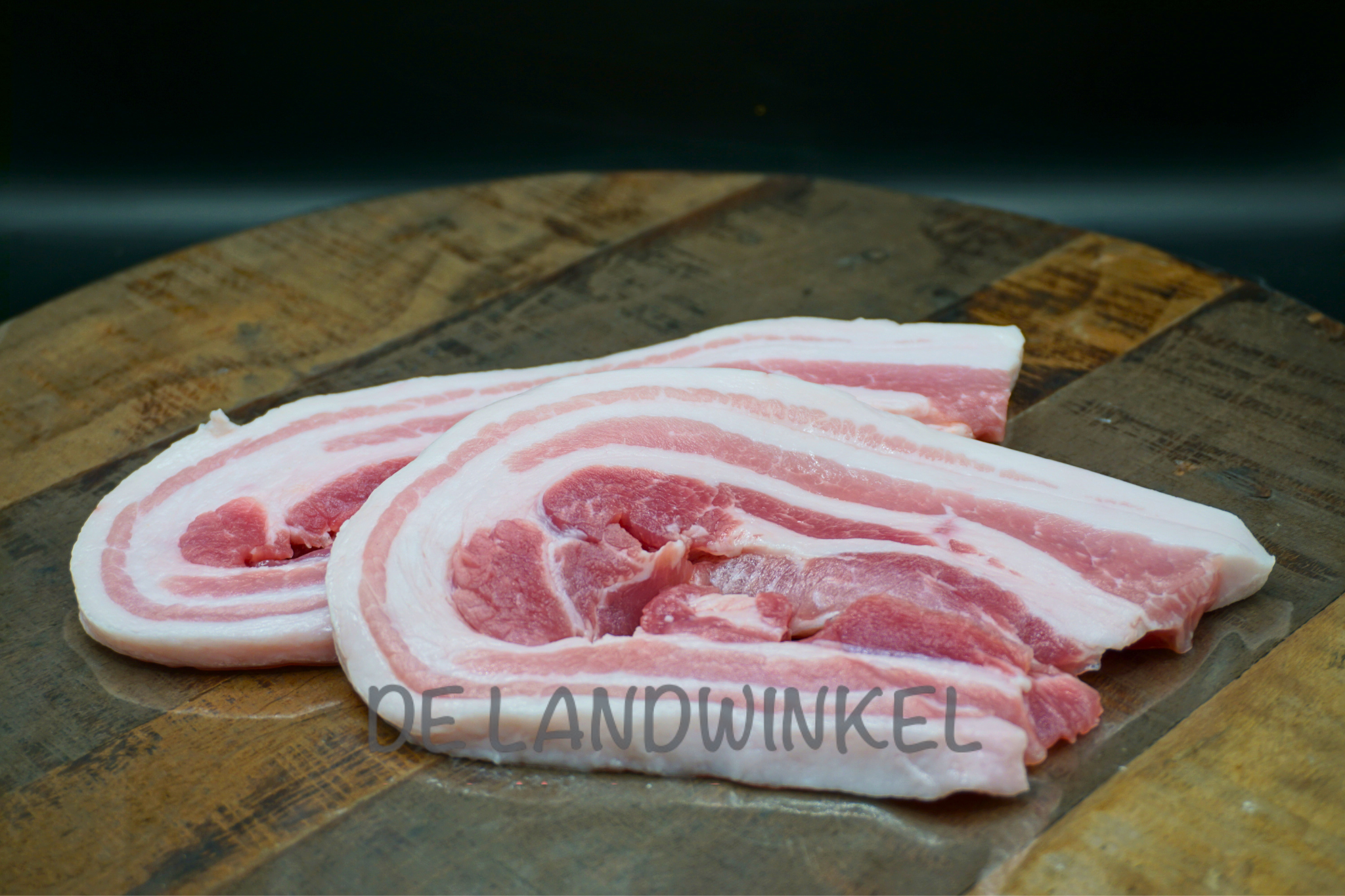 De speklappen van Kuusj, het scharrelvarken zijn gesneden van hoogwaardig buikspek van onze ‘Kuusje’-varkens, die jaarrond vrij rondlopen op ruime, natuurlijke percelen. Door hun vrije leefwijze en natuurlijke voeding is het vlees sappig, mals en mooi doo Lees meer