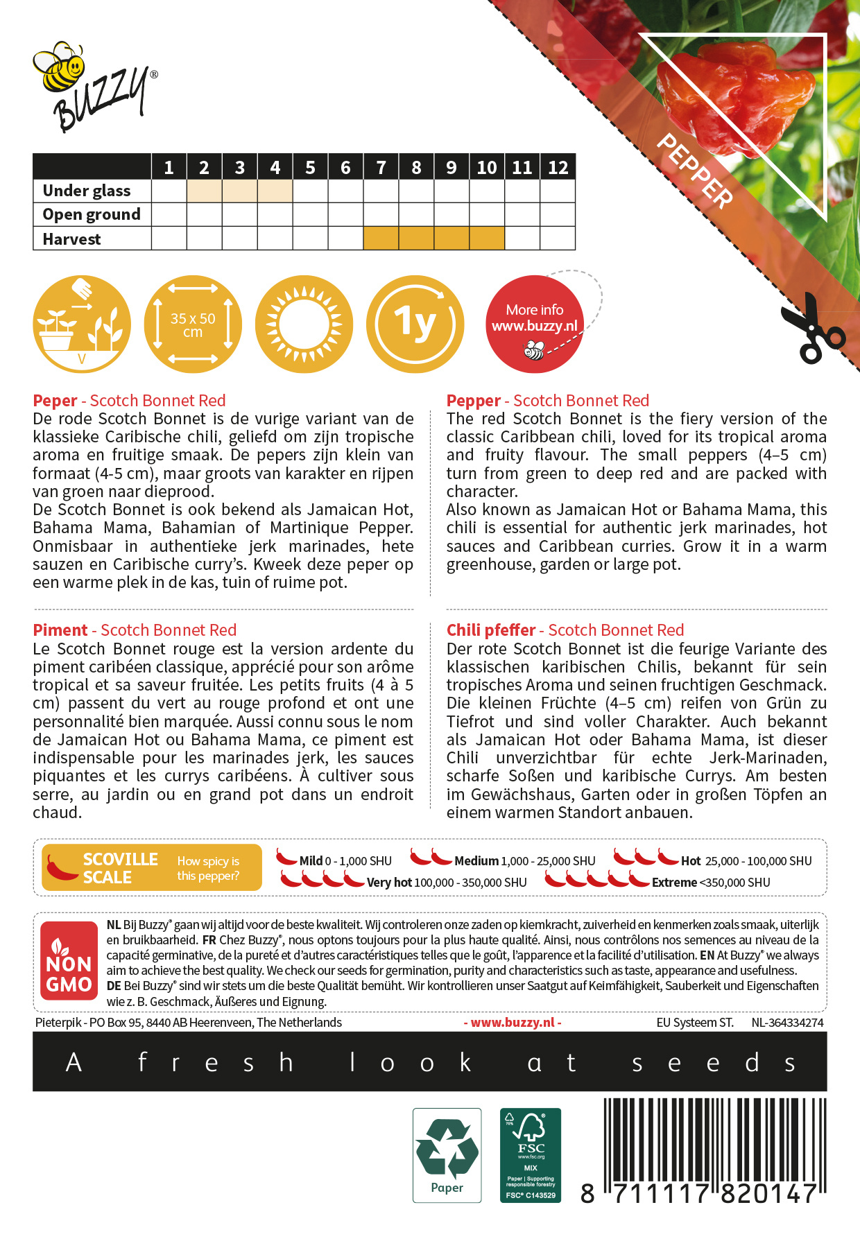 De Buzzy Culinary Peper Scotch Bonnet Red is een vurige Caribische chili, geliefd om zijn tropische aroma en fruitige smaak. De kleine pepers van 4–5cm. rijpen van groen naar dieprood en hebben een onmiskenbaar pittig karakter.