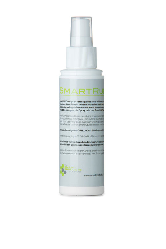 SmartRub™ reinigt en verzorgt alle natuur rubberen artikelen door het alleen maar even in te sprayen en uit te wrijven. De unieke formule trekt in het rubber en maakt het weer zacht en soepel. Toepassing: Reinig de laarzen met water en eventueel zachte zeep. Laat ze drogen. SmartRub even schudden voor gebruik. Spray het rubber in met SmartRub, laat het intrekken en veeg het overtollige weg met een zachte doek.