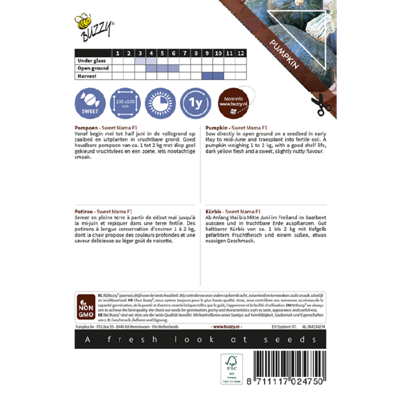 Zaai Pompoen Sweet Mama F1 en oogst goed houdbare pompoenen van 1 tot 2kg. met diep geel vruchtvlees en een zoete, licht nootachtige smaak. De eetbare schil maakt deze rankende pompoen veelzijdig in de keuken, ideaal voor soep, puree of ovenschotels.