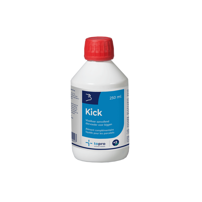 Topro Kick is een vloeibaar aanvullend diervoeder voor een extra energieboost bij pasgeboren biggen. Het middel bevat energie, korte keten vetzuren, probiotica, vitaminen en eipoeder.
