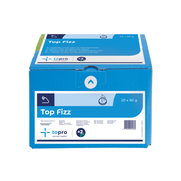 Topro Top Fizz is een aanvullend dieetvoeder voor kalveren in de vorm van een bruistablet. De bruistablet dient ter stabilisatie van de water- en elektrolytenbalans en ondersteuning van de fysiologische spijsvertering.