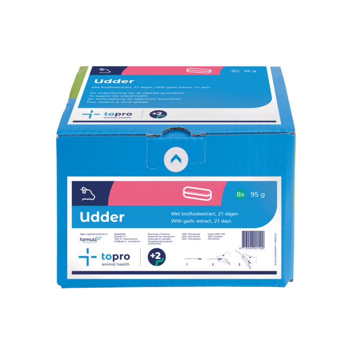 De Topro Udder bolus bevat 2 stabiele vormen van allicine. Deze zijn zorgvuldig geïsoleerd én geconcentreerd om een stabiele en langwerkende vorm van allicine te verkrijgen Dit maakt de Topro Udder bolus zeer geschikt voor koeien die extra ondersteuning van de gezondheid nodig hebben.