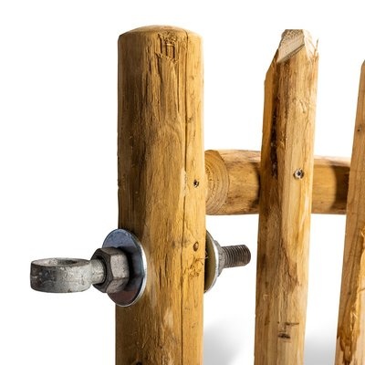 Ons advies is om de poort aan kastanje palen de hangen met een minimale dikte van Ø10/12cm. De palen moeten voor de stevigheid minimaal 1/3 in de grond geplaatst worden. De palen kunnen onbehandeld in de grond geplaatst worden en hoeven niet in beton gestort te worden. Het beton zorgt namelijk voor een kortere levensduur van de palen, dit komt door het vocht wat tussen de paal en het beton blijft zitten. Mocht het hek op den duur toch iets scheef zakken dan kun je dit eenvoudig herstellen d.m.v. de verstelbare duimen.
